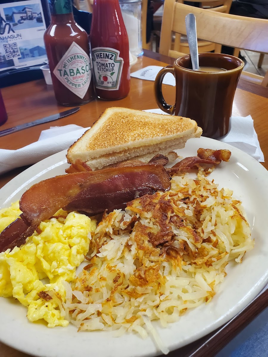 One Pancake or French Toast Bacon or Sausage & 1 Egg